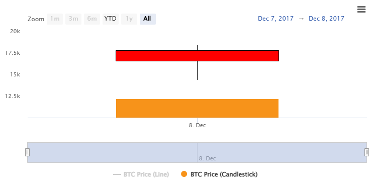 On this day in 2017, Bitcoin closed at $16,569, experiencing a dramatic 6.9% drop as the cryptocurrency approached its historic all-time high. This occurred just days before Bitcoin would peak at approximately $19,000 on December 17, 2017, marking the climax of the year's unprecedented bull run that saw Bitcoin gain over 1,300% throughout 2017. The volatility on December 8th foreshadowed the market turbulence that would follow, as Bitcoin would enter a prolonged bear market in 2018.